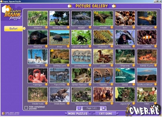 Восхитительная игра для любителей загадки, каждое из 50 ярких изображений показывает слонов, львов, бизона, пингвинов в их естественных средах обитания. В этой игре есть возможность самому делать мозайки, выбирать уровень сложности и много еще всего.