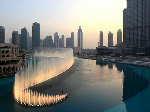 Фонтан Дубай — музыкальный фонтан, расположенный рядом с небоскрёбом Бурдж-Халифа. Это один из самых больших и высоких фонтанов в мире. Высота его струй достигает 150 метров, примерно высоты 50-го этажа. И тем не менее, это всего лишь одна пятая высоты небоскрёба. Фонтан подсвечен 50 цветными прожекторами и 6000 источниками освещения.
