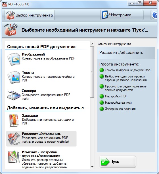 PDF-Tools — набор полезных инструментов для манипуляции с PDF файлами. С помощью данного набора вы сможете с легкостью создавать новые PDF документы из изображений, сканера и текстовых документов, изменять содержимое существующих PDF документов (добавление закладок, объединение и разъединение PDF файлов, извлечение страниц и изображений, оптимизация PDF документов, изменение настроек PDF документа, включая размер и разрешение страницы, конвертация PDF в оффисные документы и т.д.), а также отправлять и загружать файлы по почте или через FTP-соединения. Стоит упомянуть, что данная программа входит в состав PDF-XChange Pro. Все операции в программе осуществляются с помощью пошаговых мастеров. Интерфейс программы многоязычный и обладает поддержкой русского языка.