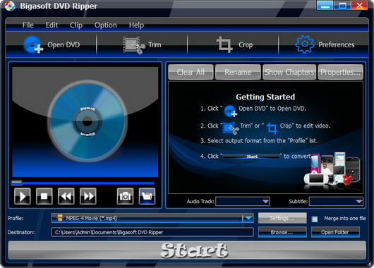 Bigasoft DVD Ripper - граббер видео DVD в форматы для мобильных устройств, поддержка AVI, DivX, Xvid, MP4, H.264, WMV, MOV, FLV, MKV, MPEG-1, MPEG-2, 3GP, 3GPP, VOB, RM и других форматов, извлечение аудио из видео DVD в MP3, WMA форматы, поддержка iPod, iPhone, Apple TV, Zune, Xbox 360, PSP, PS3, Archos, iRiver PMP Player, Creative Zen, PMP, MP4 player, Pocket PC, PDA, Smartphone, mobile phone и других, выбор файлов для извлечения, выбор сегмента (ролика) из видео, настройка параметров сохранения, пакетный режим конвертирования, предварительный просмотр в встроенном проигрывателе, нормализация аудио, создание и редактирование ID3v1 и ID3v2 тэгов.