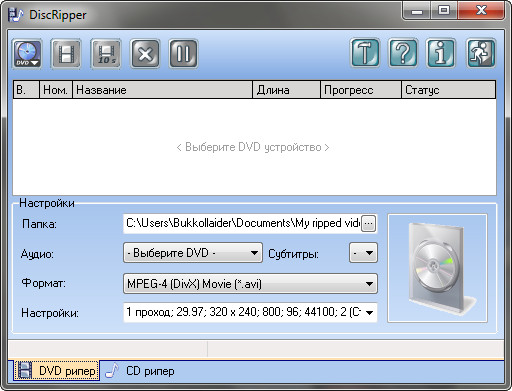 DiscRipper - рипер-конвертор двойного назначения, для кино и музыки. Позволяет снимать видео и аудио информацию с audio CD и DVD video дисков и превращать их в удобочитаемые компактные и мобильные форматы: видео DVD с двойным проходом в AVI, MPEG1, MPEG2, MPEG4, DIVX, XVID, H.264, WMV, 3GP, 3G2; аудио CD в MP3, OGG, WAV, APE. Что позволяет легко просматривать, прослушивать и передавать материал не только на бытовых проигрывателях, но и на мобильных устройствах, например таких как iPod, iPhone, PSP, Creative Zen и прочих. Имеет гибкую систему установки необходимых выходных параметров.