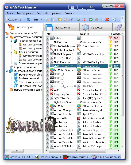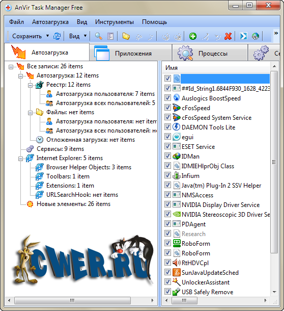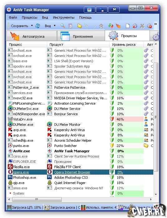 AnVir Task Manager Free - мощный менеджер процессов и программ автозагрузки с функциями анти-трояна и antispyware. Показывает полную информацию о процессах: dll, окна, соединения, потоки, хендлы, драйвера, версию файла, в трее - загрузку диска и процессора. Мониторит попытки добавления программ в автозагрузку. Позволяет отловить трояны и spyware по своей базе и по результатам анализа. Ускоряет загрузку Windows за счет отложенного запуска программ автозагрузки.