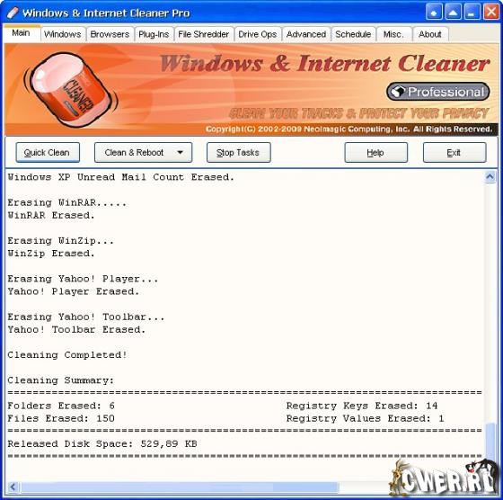 Отличная программа для очистки операционной системы от ненужных файлов. Windows & Internet Cleaner Pro удалеет различные временные файлы, историю переходов и кэш браузера, поддерживает такие браузеры как: IE, Netscape, opera, MSN, AOL. Также в программе есть встроенный менеджер автозагрузки windows, планировщик заданий. Присутствует возможность удаления файлов без возможности их восстановления.