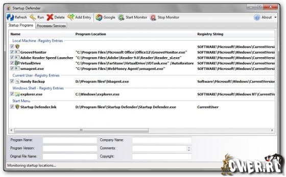 Startup Defender - это маленькая программа для Windows, которая находится в трее и следит, чтобы некоторые программы не запускались автоматически без вашего ведома. Если программа захочет прописать себя в автозагрузку, Startup Defender покажет вам окошко и спросит, можно ли программе внести себя в список автозагрузки. Вы сможете включить/исключить программы из списка автозагрузки. Если вы не уверены на счет некоторых программ, вы сможете поискать их описание в Интернете и узнать, насколько опасна та или иная программа. Для программ, которые постоянно стараются занести себя в список автозагрузки у Startup Defender есть автоблок, который будет предотвращать попытки программ занести себя в список автозагрузки.