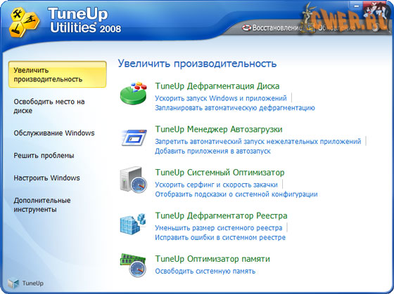 TuneUp Utilities 2009 - компактный пакет системных утилит с мощными возможностями: чистка и исправление ошибок системного реестра, восстановление и безвозвратное удаление данных, оптимизация оперативной памяти, менеджер процессов и автозагрузки, корректное удаление ставшего ненужным ПО, управление сетевыми параметрами, оптимизация интернет-соединения, настройка "скрытых" параметров системы, подробная информация о системе и многое другое.
