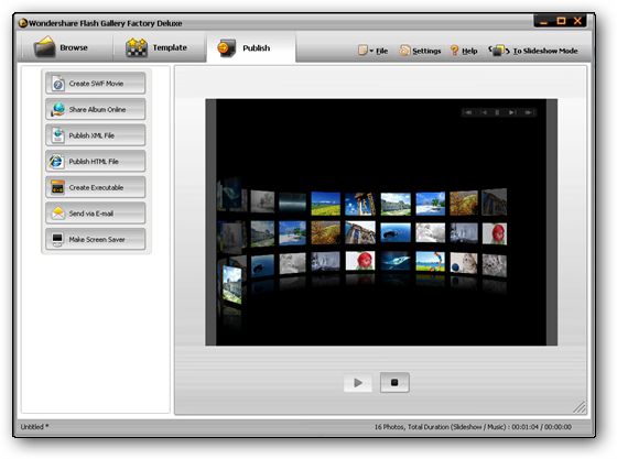 Wondershare Flash Gallery Factory - очень мощная и в тоже время простая в пользовании программа для создания Flash галереи. Wondershare Flash Gallery Factory включает в себя большой набор шаблонов, которые позволяют делать разнообразные презентации снимков, как для web дизайна, так и обычные flash слайд шоу. Цифровой фотоальбом, 3D flash галерея, web галерея, flash слайд шоу, а также flash баннеры, можно создать в Wondershare Flash Gallery Factory без навыков программирования.