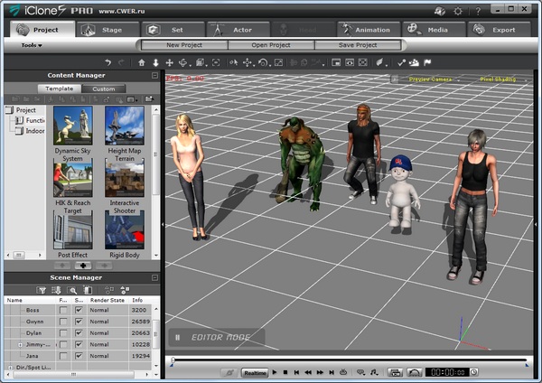 iClone - программа для легкого создания трехмерной анимации. В программе уже имеются готовые 3D-персонажи и все необходимое для создания их виртуального мира — одежда, реквизит, ландшафты. Присутствует и большая библиотека движений, которые можно присваивать персонажам. Интересной особенностью программы является возможность использования для лиц ваших трехмерных персонажей фотографии реальных людей. Для этого используется технология FaceTrix, превращающая фотографию в 3D-объект. Программа хорошо взаимодействует с редакторами 2D-графики, благодаря чему можно легко и просто редактировать текстуры. iClone также поддерживает программы 3ds Max или Maya, с помощью которых можно создавать элементы библиотеки для персонажей. Все сцены программа позволяет визуализировать в реальном времени с учетом рельефа, отражений и прозрачности.