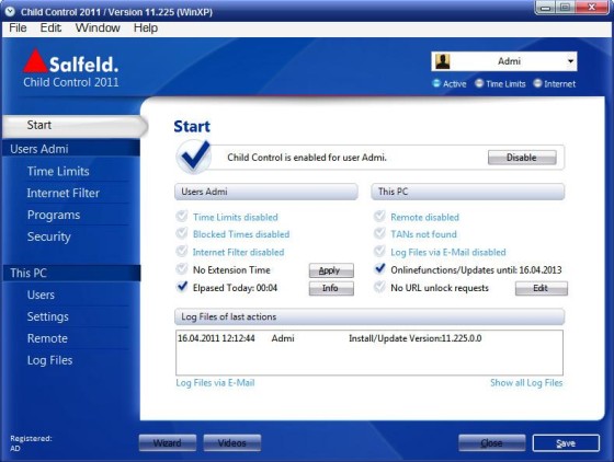 Программа Salfeld Child Control ограничивает время, проводимое вашими детьми за компьютером, как только выделенное им время закончится, компьютер автоматически выключится и повторный вход будет возможен только после ввода пароля. Ограничение можно ввести как по общему времени (например, не более 1 часа в день), так и по периоду времени, когда можно работать (например, с 22:00 до 8:00 доступ запрещен). Кроме этого, программа позволяет запретить посещение нежелательных сайтов, а также заблокировать доступ к определенным дискам и папкам.