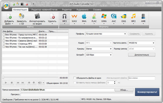 AVS Audio Converter - программа для преобразования аудио файлов из одного формата в другой. Поддерживает конвертирование WAV, OGG Vorbis, MP3, MP2, Microsoft ADPCM, WMA, VOX, AAC, M4A, AMR и других аудио форматов. До процесса преобразования программа определяет частоту, число каналов и другие параметры аудио файлов. Кроме этого, AVS Audio Converter позволяет задавать настройки параметров для MP3 и форматов OGG при преобразовании аудио-файлов и изменять информацию в тэгах. Дружественный и удобный интерфейс, расширенная поддержка форматов, которые предлагает AVS Audio Converter, превратят в удовольствие рутинную операцию конвертации аудио.