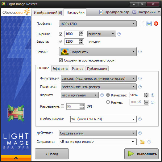 Light Image Resizer ранее известный как VSO Image Resizer - программа для изменения размеров цифровых картинок и изображений в различных графических форматах (на данный момент поддерживается работа с файлами JPEG, GIF, BMP, TIFF, CR2, NEF и т.д.). Также в утилите имеются возможности для компрессии файлов, конвертирования из одного формата в другой, экспорта, наложения и управления картинками. Light Image Resizer интегрируется в оболочку Windows, может работать в пакетном режиме, обладает расширенными опциями настройки для продвинутых пользователей.