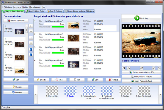 Slideshow XL - программа для легкого и быстрого создания слайд-шоу из ваших фотографий. Для этого вам нужно указать директорию с изображениями и добавить нужные картинки в окно программы. На каждое изображение вы сможете накладывать различные эффекты перехода, текстовую информацию, указать продолжительность показа картинки, а также быстро отредактировать каждую фотографию во встроенном редакторе изображений.