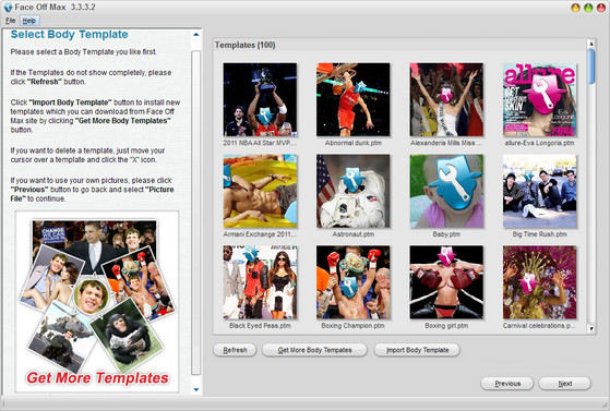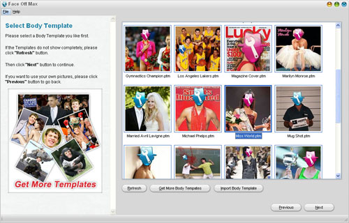 Face Off Max - программа поможет Вам сделать фото, наложив свое или чъето лицо на чужую фотографию. Разве вы ни когда-нибудь задумывались, как вы будете выглядеть имея другое тело? Не хотелось бы иметь фотографию с группой знаменитостей или на обложке журнала? Теперь Face Off Макс позволит вам сделать это и позабавить своих коллег, друзей. Face Off Max имеет простой и удобный интерфейс, инструкции и сотни фантастических шаблонов что позволит любому стать профессиональным художником.