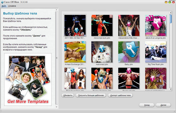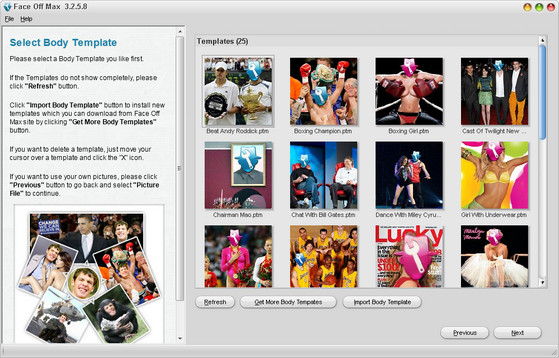 Face Off Max - эта простая в использовании программа поможет Вам сделать собственное оригинальное фото, наложив, например, "свое лицо" на чужую фотографию. Наверно Вы хотя бы раз в жизни задумывались над тем, как бы Вы смотрелись, имея совершено другое тело? Не хотелось бы Вам иметь в своей коллекции фотографию, где Вы лично присутствуете в компании знаменитостей или на обложке известного журнала? Отлично, теперь Face Off Макс позволит вам наложить одно фото на другое и от души позабавить своих друзей, знакомых и коллег.