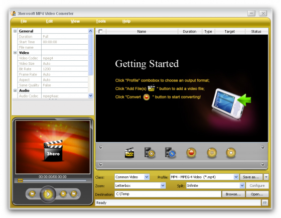 3herosoft MP4 Video Converter - конвертер большинства популярных аудио и видео форматов в форматы для мобильных устройств, поддержка AVI, MPEG, DivX, MOV, RM, WMV, 3GP, VOB, H.264/MPEG-4 AVC, VCD, DV и других видео форматов, поддержка iPhone, iPod, PSP, Apple TV, Archos AV500, Archos AV700, Archos Gmini402, iRiver PMP-100, Creative Zen Vision и других, конвертер WMA, MP2, OGG, RA, AC3, CDA аудио в MP3, AAC, M4A форматы, извлечение аудио из видео файлов в MP3, AAC, M4A форматы, поддержка выбора начала и конца в файлах для конвертирования или извлечения, пакетный режим конвертирования, выбор и настройка параметров конвертирования, извлечения, поддержка изменения размера картинки и переконвертирования в том-же формате, создание и редактирование ID3 тэгов, предварительный просмотр или прослушивание в встроенном проигрывателе.