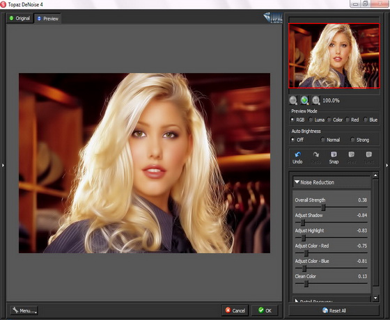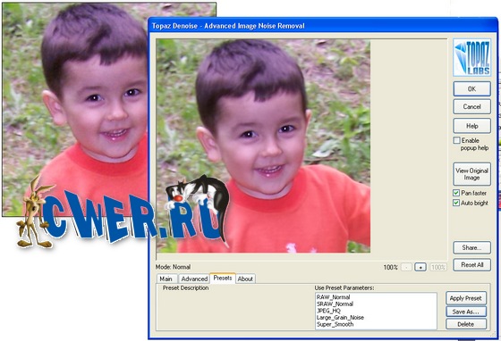 Topaz DeNoise - один из лучших плагинов для борьбы с цифровыми шумами разработаный для Adobe Photoshop. Плагин использует несколько алгоритмов обработки изображения в зависимости от формата исходного материала, имеет несколько уровневую систему корректировки изображения - что несомненно даст возможность профессионалам оценить все прелести данного плагина. Для неопытных пользователей специально есть вкладка с уже готовыми преднастройками в зависимости от формата файла.