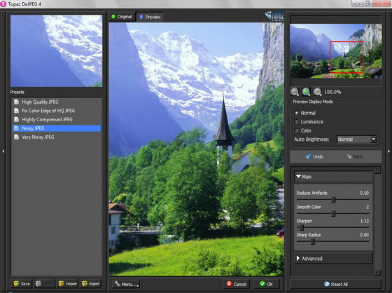 Topaz DeJPEG — плагин для удаления артефактов JPEG изображений и увеличения их четкости в Adobe Photoshop. Многим известны мелкие квадратики и размытость при сжатии JPEG изображений. Плагин для Adobe Photoshop Topaz DeJPEG поможет вам убирать квадратики и улучшать чёткость изображения. Программой очень легко пользоваться благодаря тому, что в плагине используются расширенные алгоритмы, которые достигают всегда оптимального результата. Как всегда, для быстрых манипуляций с фотографиями, вы сможете воспользоваться встроенными пресетами от Topaz Labs.