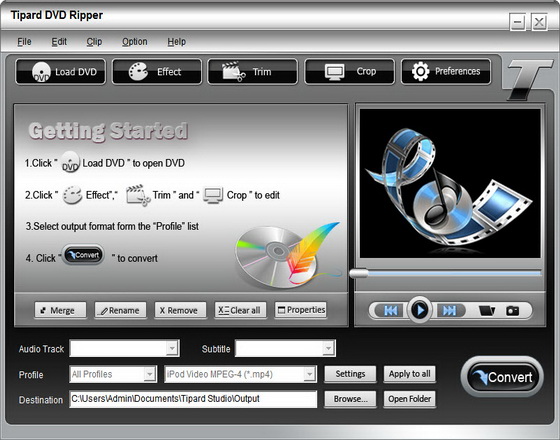 Tipard DVD Ripper - мощная и простая в использовании программа для копирования DVD-дисков с возможностью преобразования содержания в аудио и видео файлы, такие как AVI, MPEG, WMV, DivX, MP4, H.264, RM, MOV, M4V, XviD, 3GP, MP3 , WMA, WAV, RA, M4A, AAC, AC3, OGG и т.д. Программа может создавать файлы совместимые с IPod, iPhone, PSP, Apple TV и других портативных устройств. Есть варианты для преобразования сегментов клипа, изменение размера, наложение эффектов, добавление логотипов, предварительный просмотр результатов. Существует пакетная обработка файлов, получение информации из баз данных в Интернете, и многие другие функции.