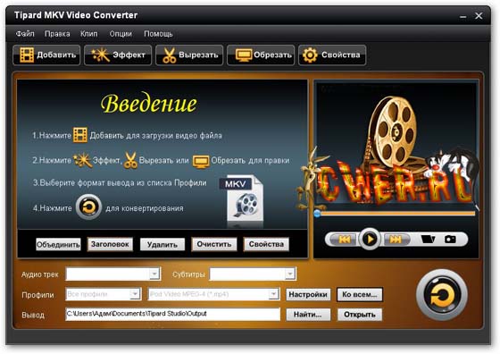 Tipard MKV Video Converter - конвертер MKV видео в другие популярные видео форматы, поддержка MKV, AVI, WMV, MPG, MKV конвертирования в AVI, MP4, WMV, FLV, 3GP, 3G2, MOV, MPG и другие форматы, извлечение аудио из видео файлов в MP3, AAC, M4A, WMA, WAV, AC3, OGG форматы, поддержка iPod, iPhone, Zune, PSP, PS3, Xbox и других, пакетный режим конвертирования, настройка параметров сохранения и конвертирования, предварительный просмотр и т.д.