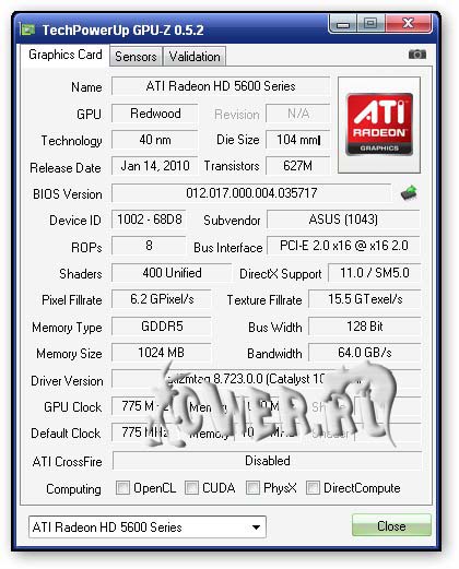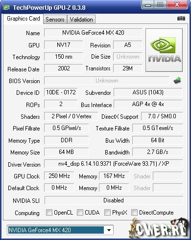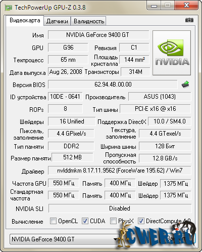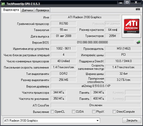 Вышла новая версия программы для вывода информации о графическом адаптере. GPU-Z поддерживает и карты NVIDIA, и ATI. Она поможет определить, какая у вас модель видеокарты, узнать интерфейс подключения, расскажет о том, какой используется графический процессор (версия BIOS, номер ревизии чипа, частота в 2D, 3D-режимах и при разгоне, сведения о поддержке DirectX).