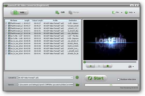 Aneesoft HD Video Converter - конвертер видео файлов различных форматов в HD видео и обратно, поддержка AVCHD (mts, m2ts), HD AVI, HD MPG, HD MPEG, HD TS, HD MOV, HD VOB, HD MP4, HD FLV, HD MKV и других видео форматов, поддержка iPod, iPhone, PSP, PS3, Apple TV, Mobile phone, MP4 players и других, пакетный режим конвертирования, предварительный просмотр результата в встроенном проигрывателе.