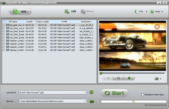 Aneesoft HD Video Converter - конвертер видео файлов различных форматов в HD видео и обратно, поддержка AVCHD (mts, m2ts), H.264/AVC, MKV, MPEG-2 (ts), HD AVI, HD FLV, HD WMV, MPEG-4, Quick Time MOV и других видео форматов, поддержка iPod, iPhone, PSP, PS3, Apple TV, Mobile phone, MP4 players и других, пакетный режим конвертирования, предварительный просмотр результата в встроенном проигрывателе.