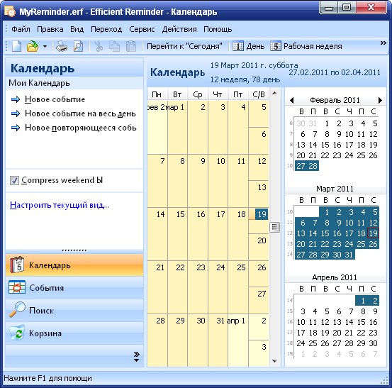 Efficient Reminder - программа - напоминатель о предстоящих встречах, днях рождения, мероприятиях и прочих важных делах. Для каждого события можно выбрать свой тип напоминания — звуковой сигнал, всплывающее сообщение, отправка сообщения на указанный адрес электронной почты и т.д. Также каждому событию можно настроить свой временной интервал и частоту напоминаний до наступления события. С помощью встроенного календаря, запланировать напоминания можно на неограниченный срок, а для удобства пользования программой, сгруппировать события по выбранным критериям, обозначив из различными цветными метками и ярлыками.