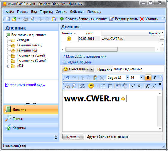 Efficient Diary - данная программа представляет собой многофункциональный персональный дневник. Efficient Diary имеет мощную систему поиска, что позволяет мгновенно найти нужную запись. Формат записей пользователь может выбрать по своему усмотрению: установить шрифт, фон и подложку страницы, добавлять рисунки, гиперссылки, таблицы и смайлики. Программа Efficient Diary позволяет защитить свой дневник паролем и хранит информацию в зашифрованном виде. В дневнике Efficient Diary имеются функции экспорта, импорта, восстановления удалённой информации, изменения вида и др. Efficient Diary дает возможность выбрать настроение и важность записи, редактировать записи в дневнике, группировать их и многое другое.